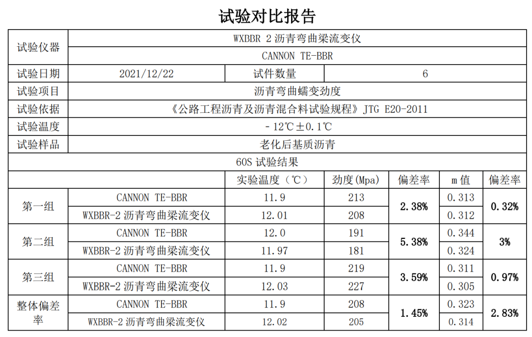 为确保设备的稳定性、精确性,旺轩科技技术研发人员于2021年12月22日将设备送到苏交科集团检测认证有限公司进行实验对比,按照《公路工程沥青及沥青混合料试验规程JTG E20-2011》中的试验方法,对湖南旺轩科技有限公司生产的WXBBR-2Pro沥青弯曲梁流变仪(BBR)与苏交科现有的美国Cannon Instrument Company生产的TE-BBR SD对老化后的基质沥青进行了三次实验对比,两台设备重复性及再现性均满足标准要求,实验结果得到检测中心专家的一致认可。